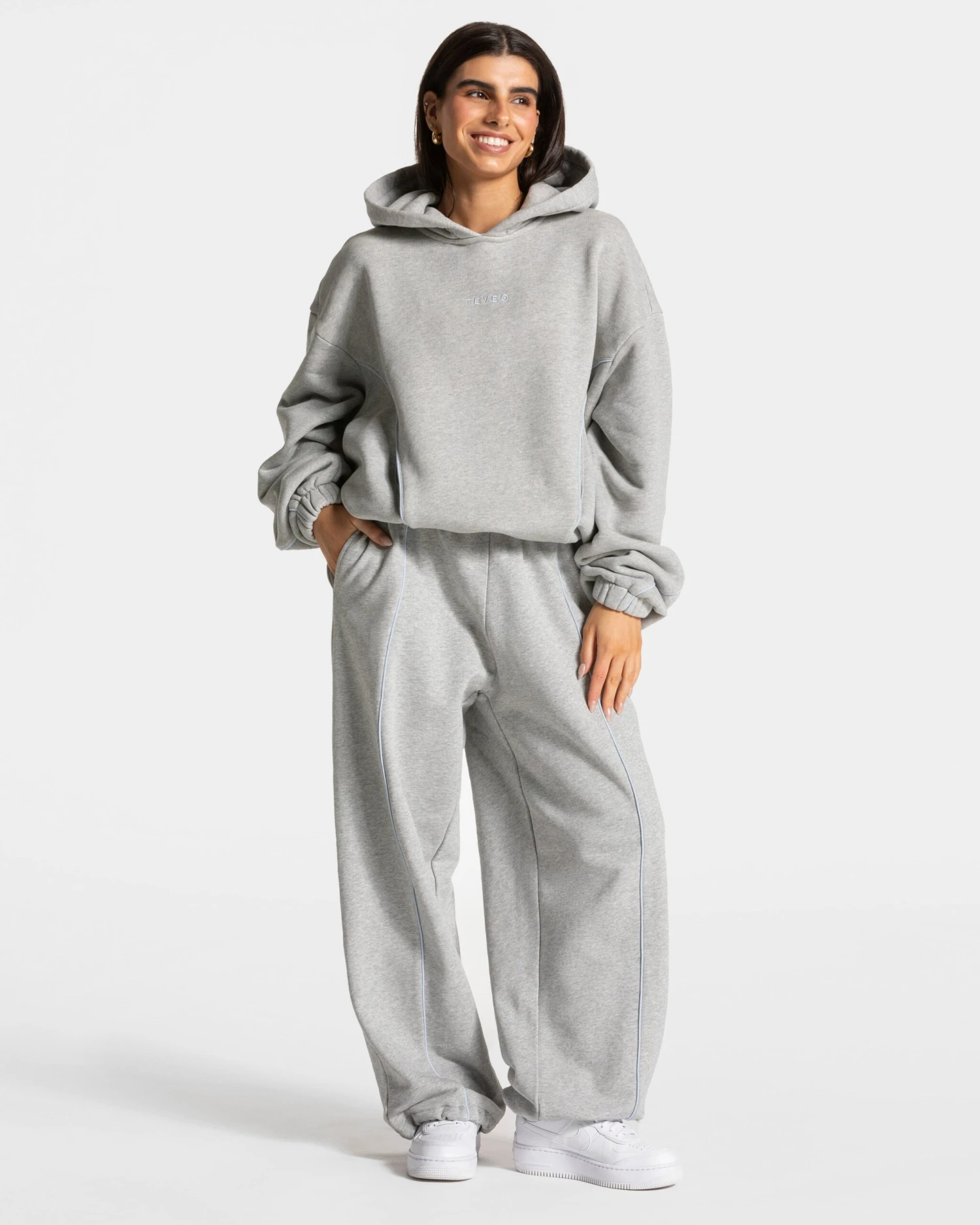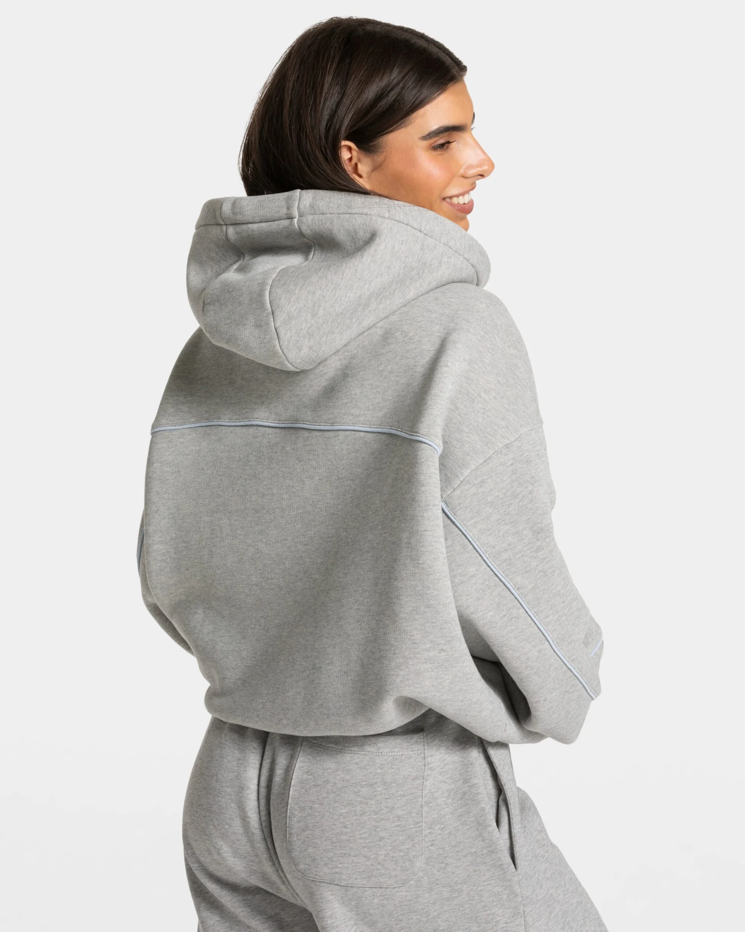 Der Ignite Hooded Sweater in Hellgrau vereint Komfort, Style und Funktionalität in einem modernen Design. Der Sweater überzeugt sowohl mit den markanten hellblauen Kontrastnähten als auch den versteckten Taschen. Mit seinem Oversized Fit und integriertem Gummizug zum Croppen sowie der festen Kapuze ist er dein perfekter Begleiter für kühle Tage, dein Warm-up oder zum Wohlfühlen.